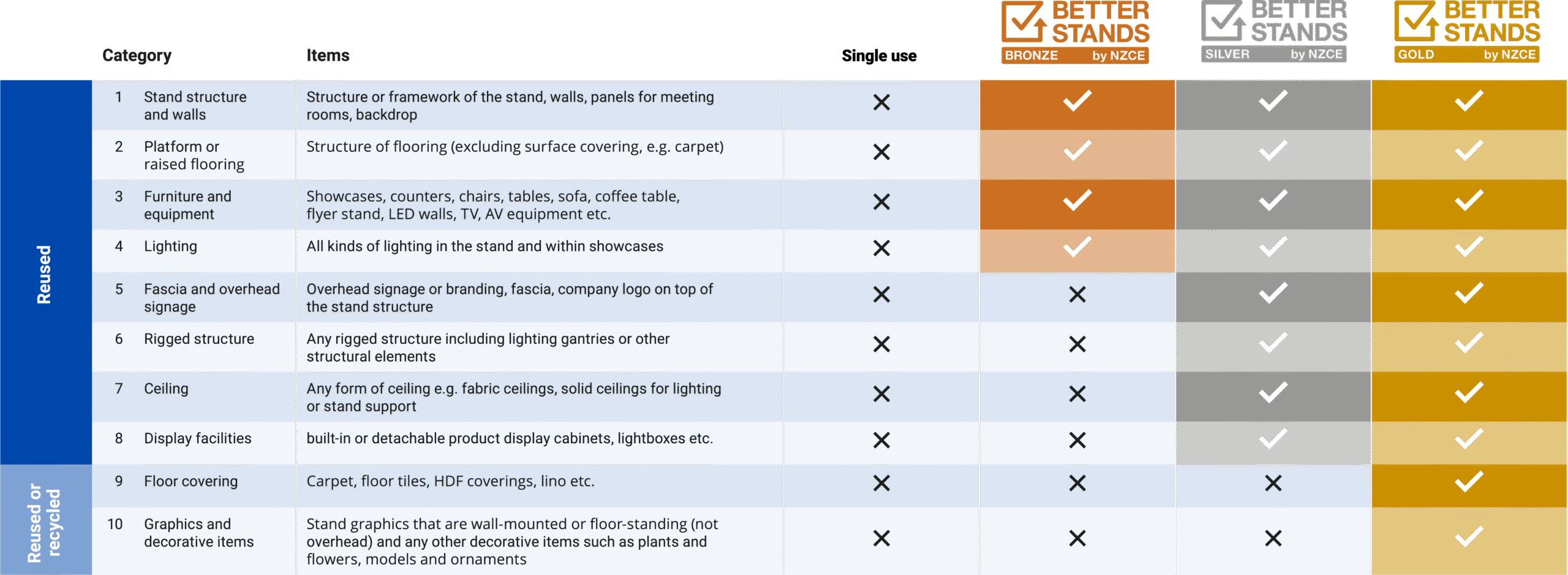 The structure of the framework facilitates a gradual transition to 100% reusable stands, with different elements of stand construction and appearance relevant to each level.